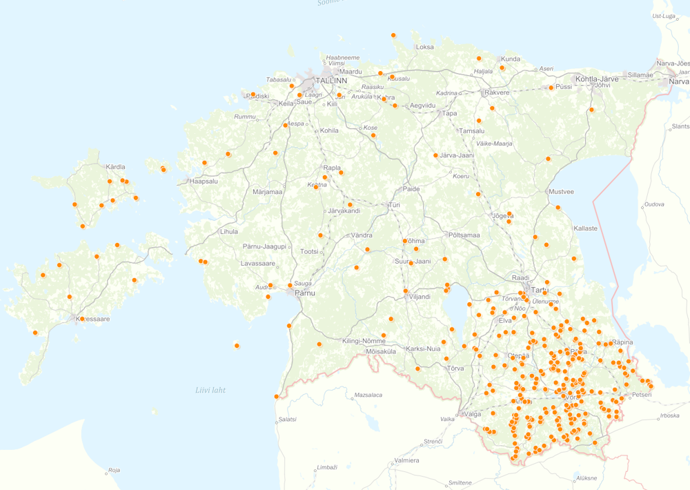 Teatele on lisatud pilt kaardirakenduse ekraanivaatest, millel on näha suitsusaunade levik Eestis praeguste andmete järgi. Allikas: X-GIS, Maa- ja Ruumiamet.